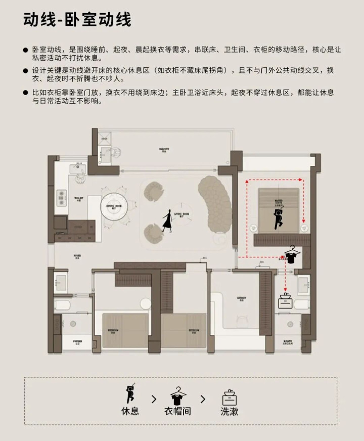 卧室的动线,起床→洗漱→更衣→化妆,顺畅丝滑。