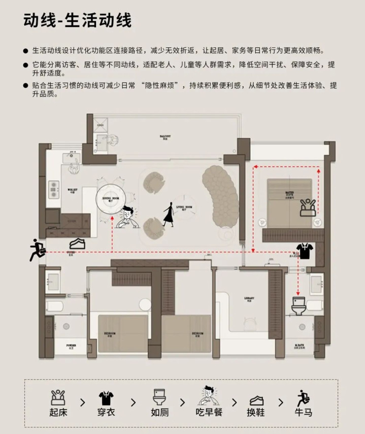 其实就是让你在家里走的路不绕弯、不重复,居住起来更加方便、舒适,例如: